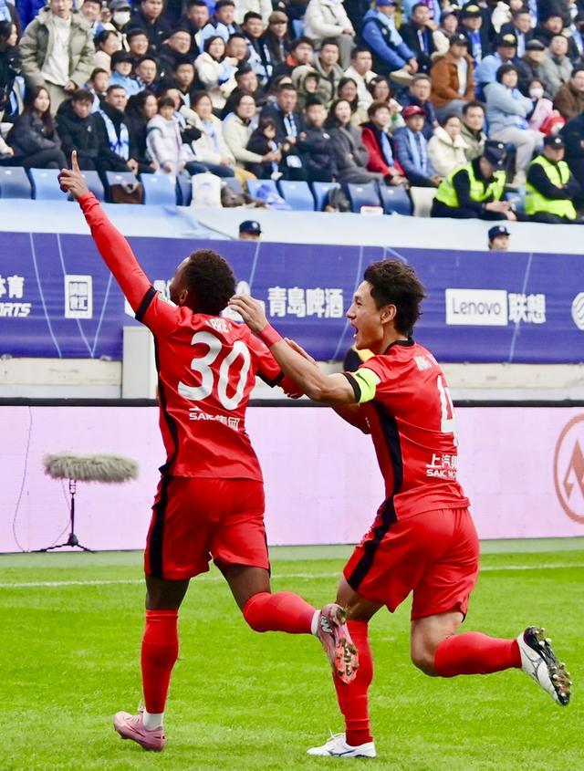 2025年11月22日 11月22日,上海海港队球员加布里埃尔(左)在进球后庆祝。 当日,在辽宁大连举行的2025赛季中国足球协会超级联赛第30轮比赛中,上海海港队客场1比0战胜大连英博海发队,获得本赛季中超联赛冠军。 新华社记者 吴青昊 摄